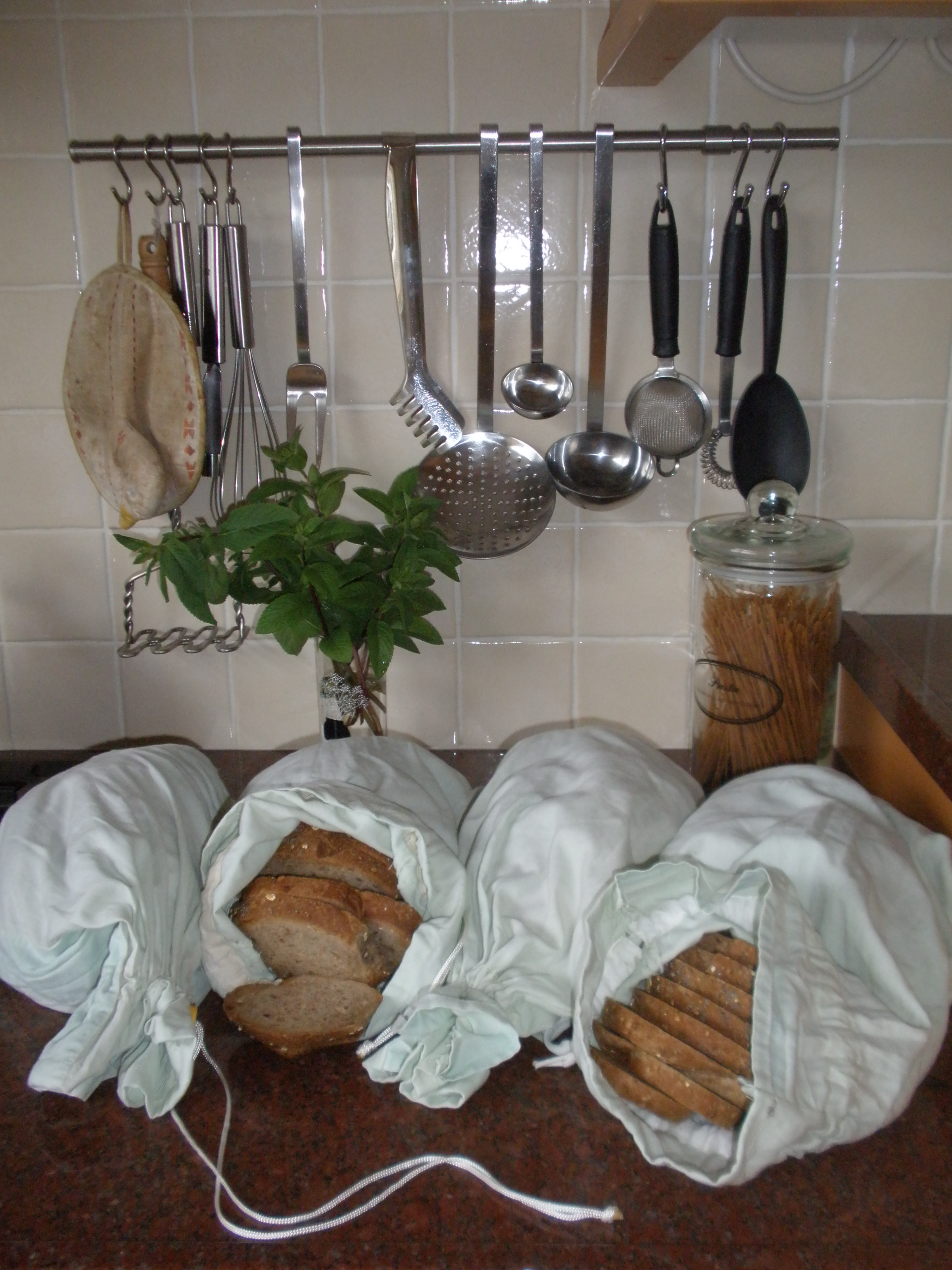 Ik gebruik ook al een tijd katoenen broodzakken. Gekocht bij Kitchenhugs.nl, maar zelf maken is misschien wel net zo handig.