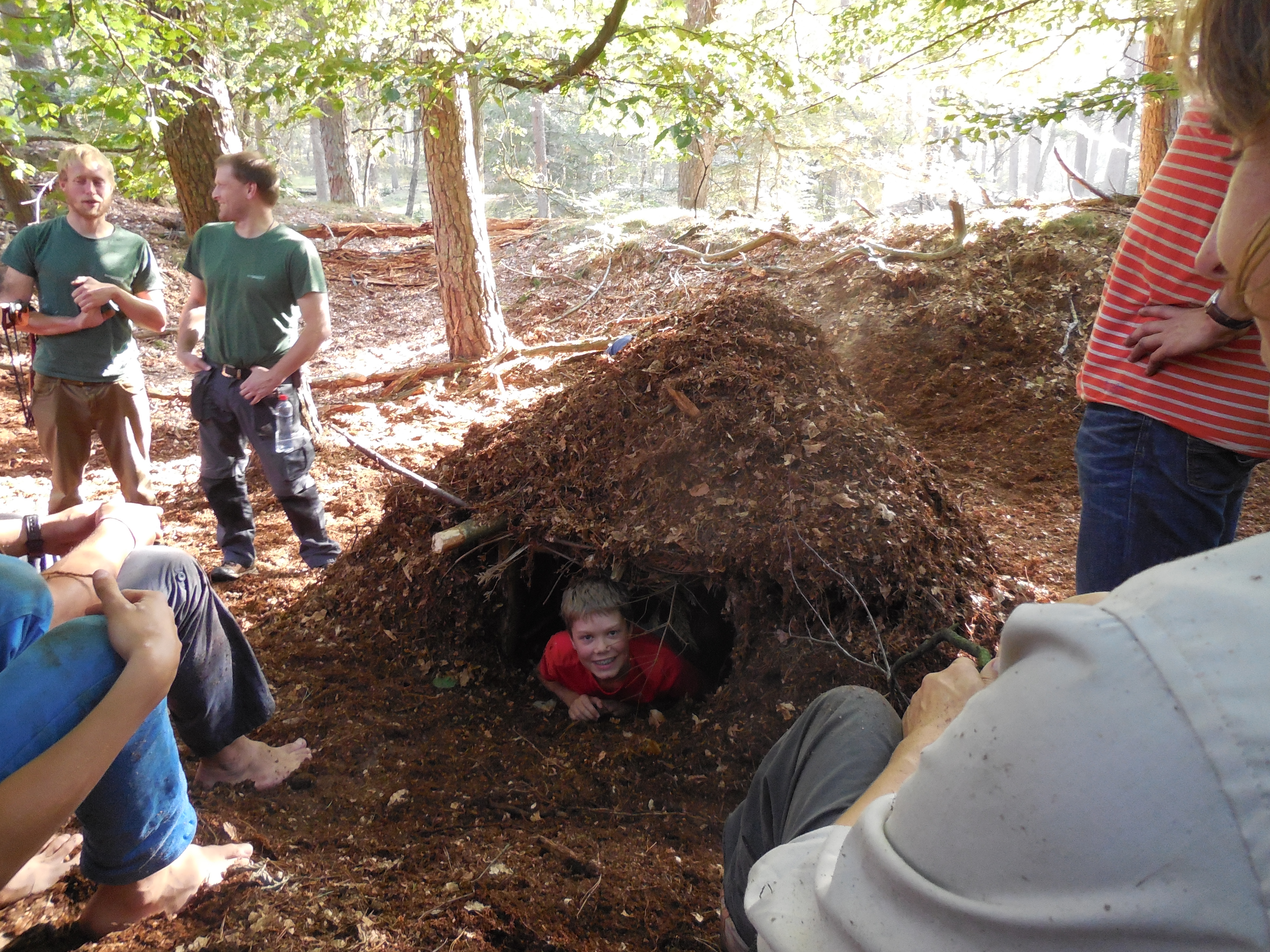 Wil je de nacht goed doorkomen dan is warm blijven een eerste vereiste. Je kunt natuurlijk een vuur maken, maar dat is zonder aansteker of lucifer niet zo makkelijk (zie verderop). Dus hebben wij geleerd hoe je een onderkomen kunt maken van takken en bladeren. Je maakt eerste een tentvormig skelet van takken en die bedek je helemaal met bladeren, heel veel bladeren, zoveel als je kunt vinden. Dan moet je niet vergeten de bodem van het onderkomen van een isolerende laag van bladeren, droog gras, mos of heide te voorzien, want anders is het toch wel koud. Daar kwamen mijn dochter en haar vriendin achter die in het zelf gemaakte bouwsel waren gaan slapen. Zij lagen op de kale grond en kregen het door het optrekkende vocht te koud. De jongetjes, in het tweede onderkomen, hadden het slimmer aangepakt en ‘sliepen’ op een schapenvacht. Ze hebben het niet koud gehad, maar met z’n drietjes was het wel een beetje krap.