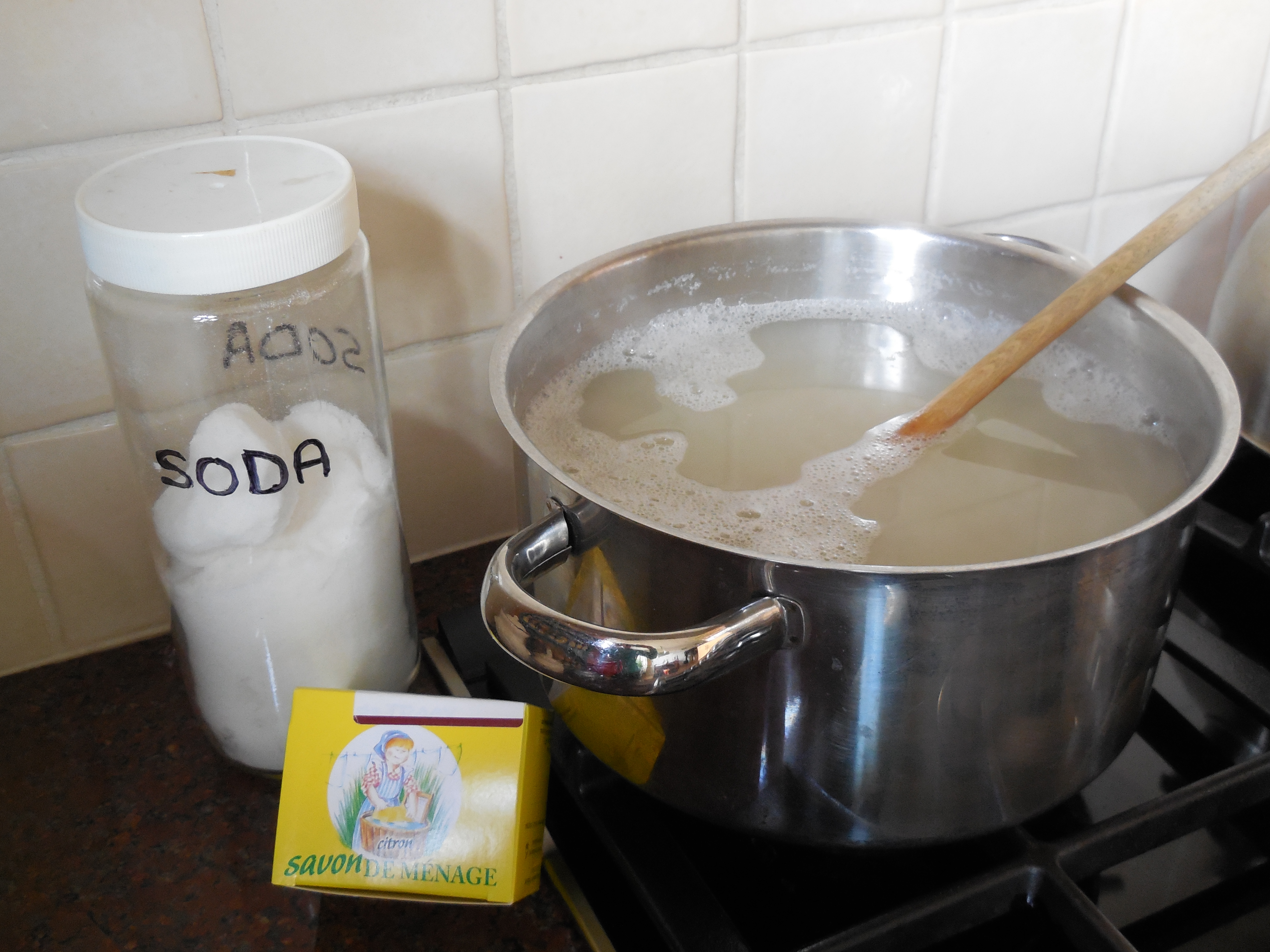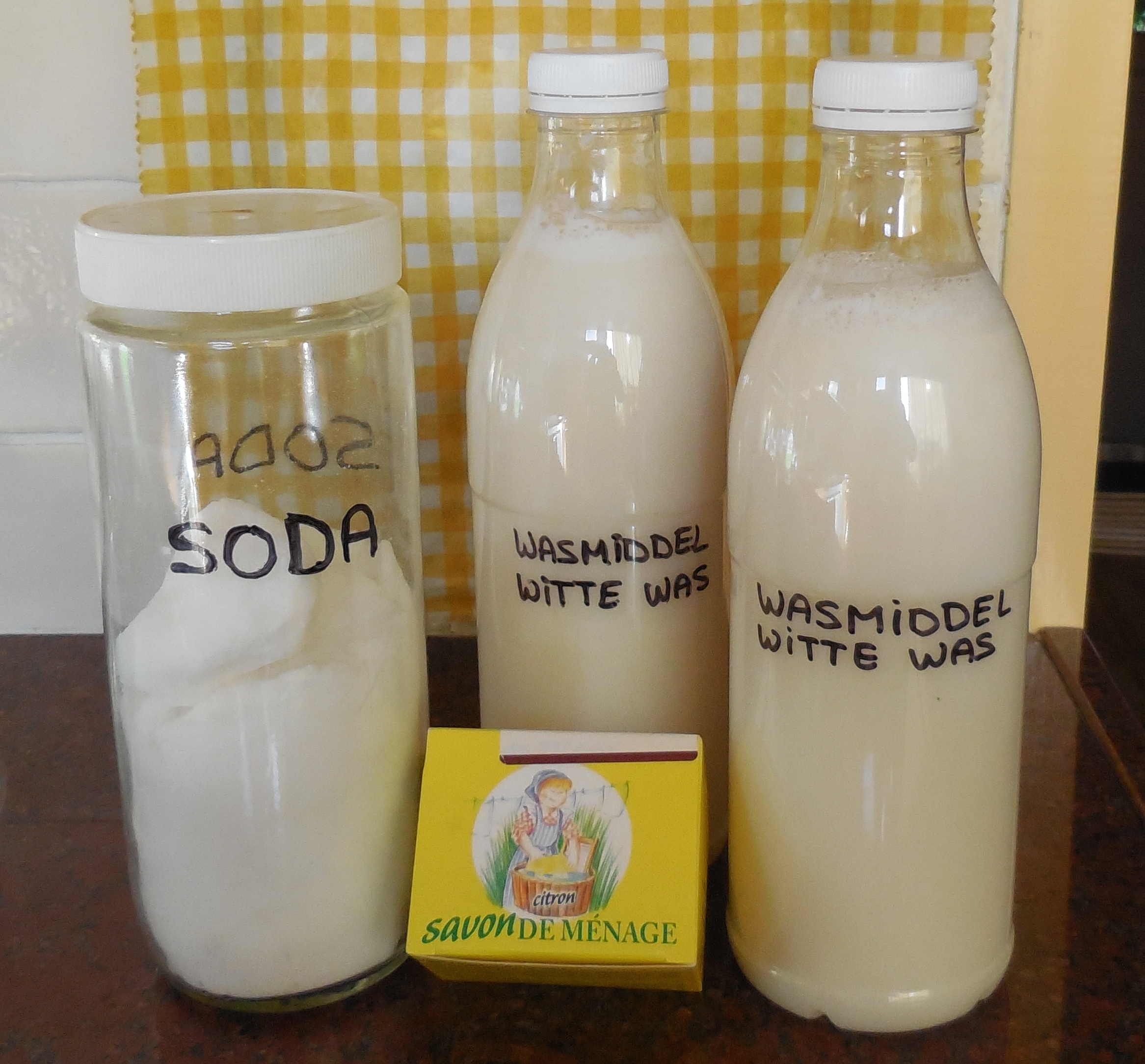 Rasp 50 gram zeep en kook het water. Doe de zeep in een grote pan (minimaal 3 liter) en voeg wat heet water toe. Zachtjes roeren totdat de zeep is opgelost. Voeg meer water toe en 50 gram soda. Vul aan tot 2,5 liter. Nu laat je het wasmiddel een paar uur staan om af te koelen. Het wordt dan uiteindelijk stijf. Dan klop je het los met een staafmixer of garde (gaat wel wat moeizaam). Eventueel kun je wat etherische olie toevoegen voor de geur, maar je kunt ook lekkere citroenzeep kiezen. Giet nu het wasmiddel in lege flessen en klaar is kees. Ik gebruik ongeveer 120 ml wasmiddel per wasbeurt en voeg vaak nog een half kopje baking soda toe voor een stralend resultaat.