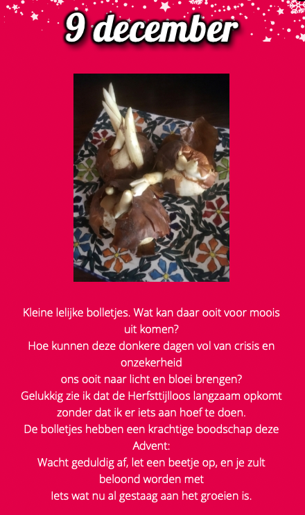 Die wordt onder andere gevonden in de adventskalender. Die zijn dit jaar ongekend populair. Het iedere dag openmaken van een venster als een klein, innig ritueel, wordt ervaren als troostrijk. “Nu het extra donker is vanwege corona leef je des temeer naar kerstmis toe, naar het licht, of in ieder geval naar een eindpunt,” zegt Erik Borgman in Trouw (9 dec 2020). Op de website van mijn parochie is ook een adventskalender geplaatst. Bij het openen van een venster komt er een mooie foto met een inspirerende of troostrijke tekst tevoorschijn. Het leuke en verbindende is dat deze foto’s en teksten zijn aangeleverd door de parochianen zelf. Dat geeft ook een zekere intimiteit, ook al is het anoniem. In de vriendengroep van mijn kinderen, zestienplussers zeg maar, zie ik ook allemaal initiatieven om toch met elkaar verbonden te blijven en iets te kunnen betekenen voor een ander. Ze hebben nu een sneeuwbalbrief in het leven geroepen. Je ontvangt een handgeschreven brief of kaart van iemand. En vervolgens schrijf jij er eentje aan de volgende op de lijst. Ik vind dit echt heel bijzonder. Welke tiener of jongere schrijft tegenwoordig nog een handgeschreven brief? Dit zijn voor mij allemaal lichtpuntjes op weg naar kerstmis.