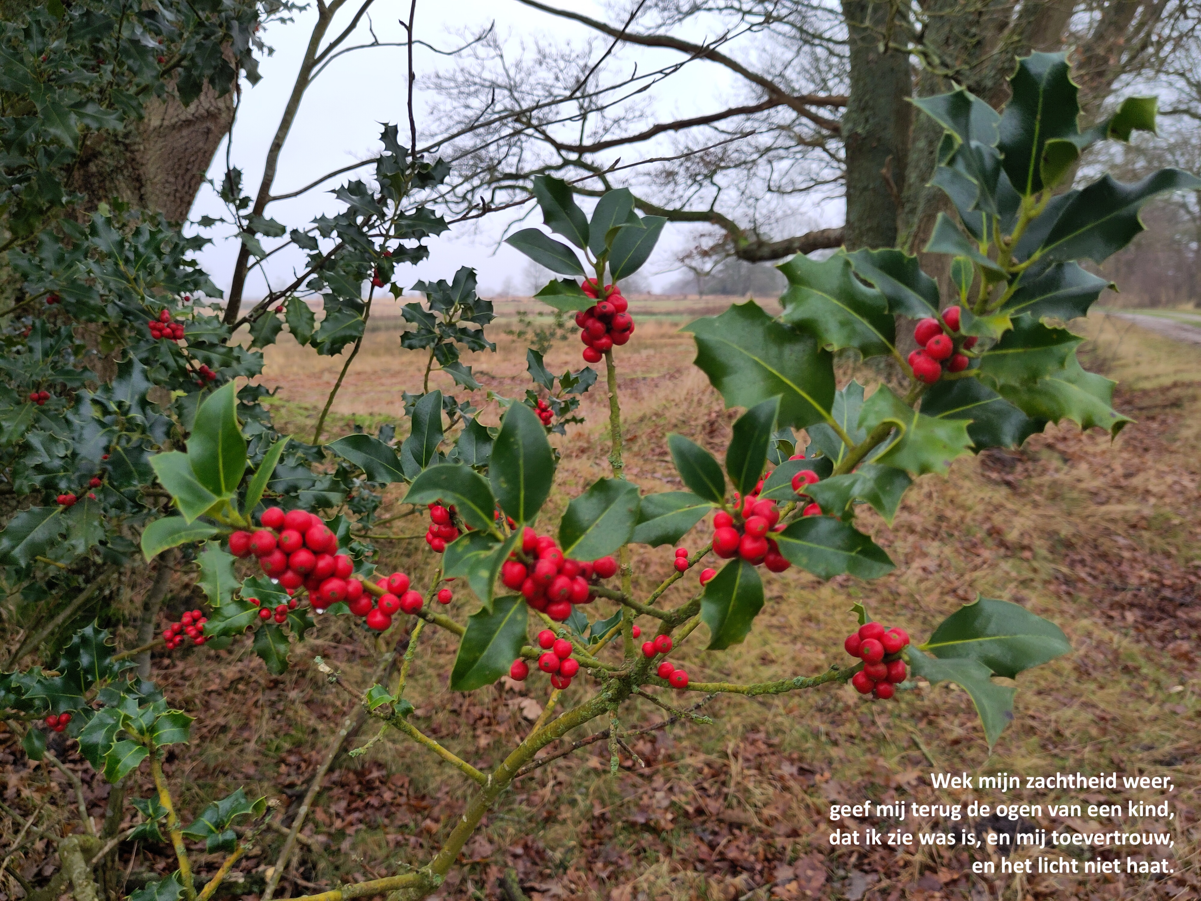 Anderhalve week gelden zwierf ik, met de zwerfgroep van de NTKC, over het Balloërveld. In de bosrand stond een prachtige hulst te pronken, vol van vrucht en blad dat niet zal dorren. Een mooie wens voor het komende jaar dacht ik. En een mooi traditioneel kerstplaatje, de rode bessen met het donkergroene blad. Alleen de sneeuw ontbrak nog.