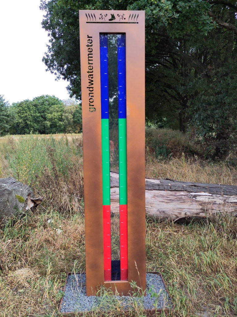 Genieten van de schoonheid en je verbonden voelen met alles om je heen, betekent echter ook dat je de pijn voelt waar het niet goed gaat. Op een gegeven moment liepen we over een tapijt van groen gevallen bladeren. Dan weet je dat de bomen stress hebben, droogte stress. Ze laten hun bladeren vallen om verdamping te minimaliseren. Maar daardoor kunnen ze minder reserves aanleggen voor de winter en de knoppen voor het volgend voorjaar. Dat het echt heel droog is in het gebied liet de grondwatermeter zien die diep in het rood stond (groen is optimaal). Zo kwam het gesprek vanzelf op klimaatverandering, verdroging, verlies van biodiversiteit en we deelden onze zorgen.