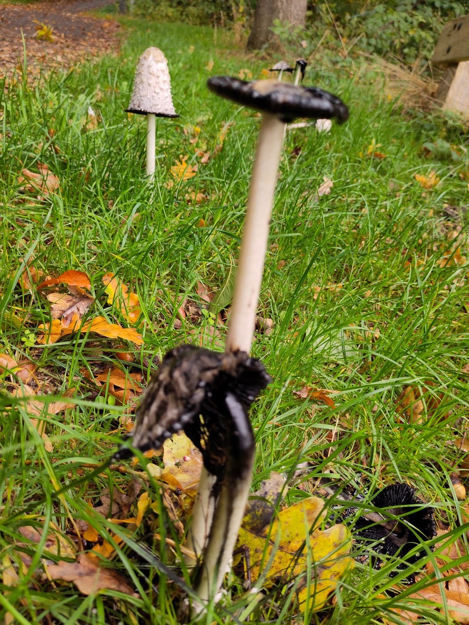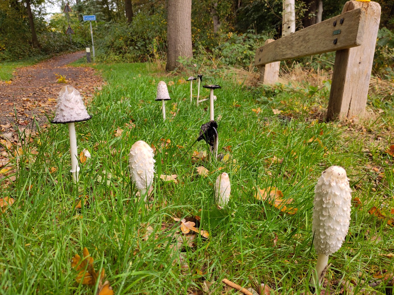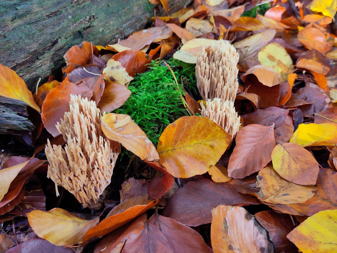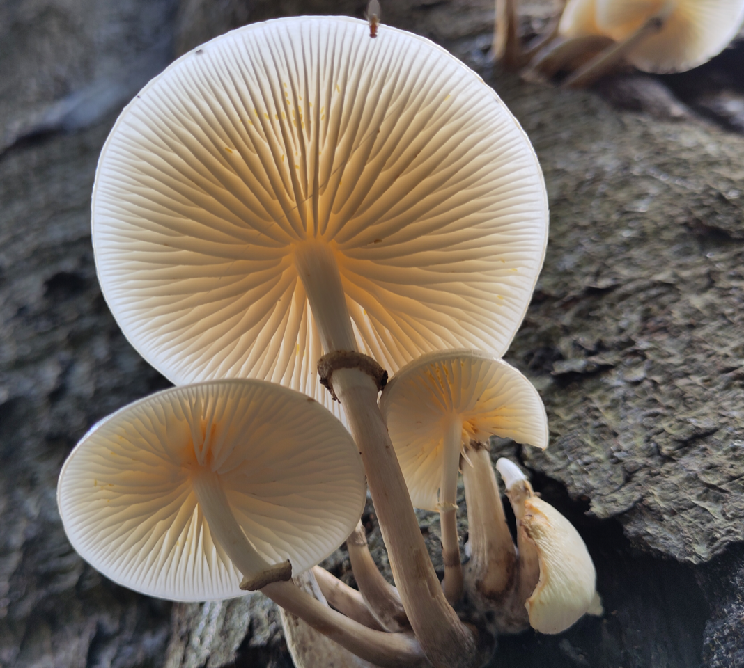 Als de bladeren vallen begint het grote opruimen. Sta je er wel eens bij stil wat een gigantische klus dat is. Elk jaar opnieuw zo’n vracht aan blad dat verteerd moet worden, om weer humus te zijn voor het bodemleven, planten en bomen. Allerlei dieren, groot en klein, bacteriën en schimmels spelen daar een rol in. Dat brengt me bij het tweede herfstfenomeen, de paddenstoelen (ze zijn er het hele jaar door, maar in de herfst het meest uitbundig). Het grootste gedeelte van de paddenstoel zit onder de grond. Een uitgebreid netwerk van schimmeldraden, mycelium, met ontelbare vertakkingen en verbindingen, ook met de wortels van bomen en planten. Maar de vruchtlichamen, de paddenstoelen spreken tot de verbeelding. Menig fotograaf gaat vol verwondering nederig op de knieën, voor die mooie foto. Maar soms moet je omhoog kijken. Zoals ik deed bij de porseleinzwammen op een mooie dikke beuk. Het had iets magisch, iets feeërieks.