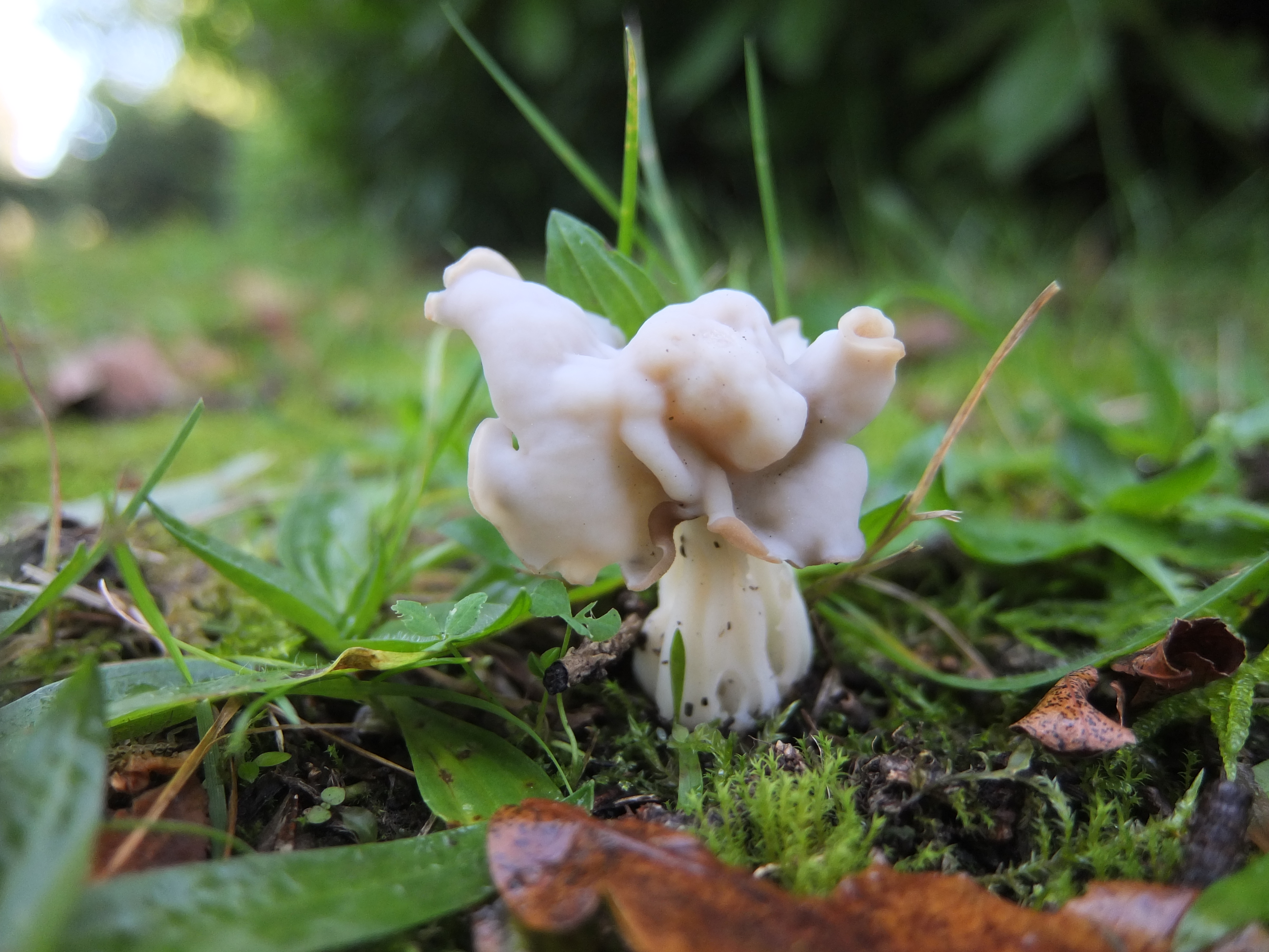 Even verderop dachten we wat rommel bij een prullenbak te zien liggen. “Laten we dat maar even in de opruimen.” Toen we dichterbij kwamen bleek het helemaal geen rommel te zijn. Het waren paddenstoelen met de meest rare vormen. Veel namen van paddenstoelen zeggen iets over hoe ze eruit zien. Dat is ook het geval bij deze paddenstoelen, die leken op hondekluiven. Het was dan ook een heel groepje witte kluifzwammen (Helvella crispa). En dan weet mijn moeder, die ook meeliep, direct te vertellen dat die een indicatie zijn voor de aanwezigheid van kalk in de bodem. Daar heb je hem weer, die zee van vroeger. Zo zie je maar weer: alles hangt met alles samen. Elke dag word je daar weer van doordrongen als je er open voor staat.