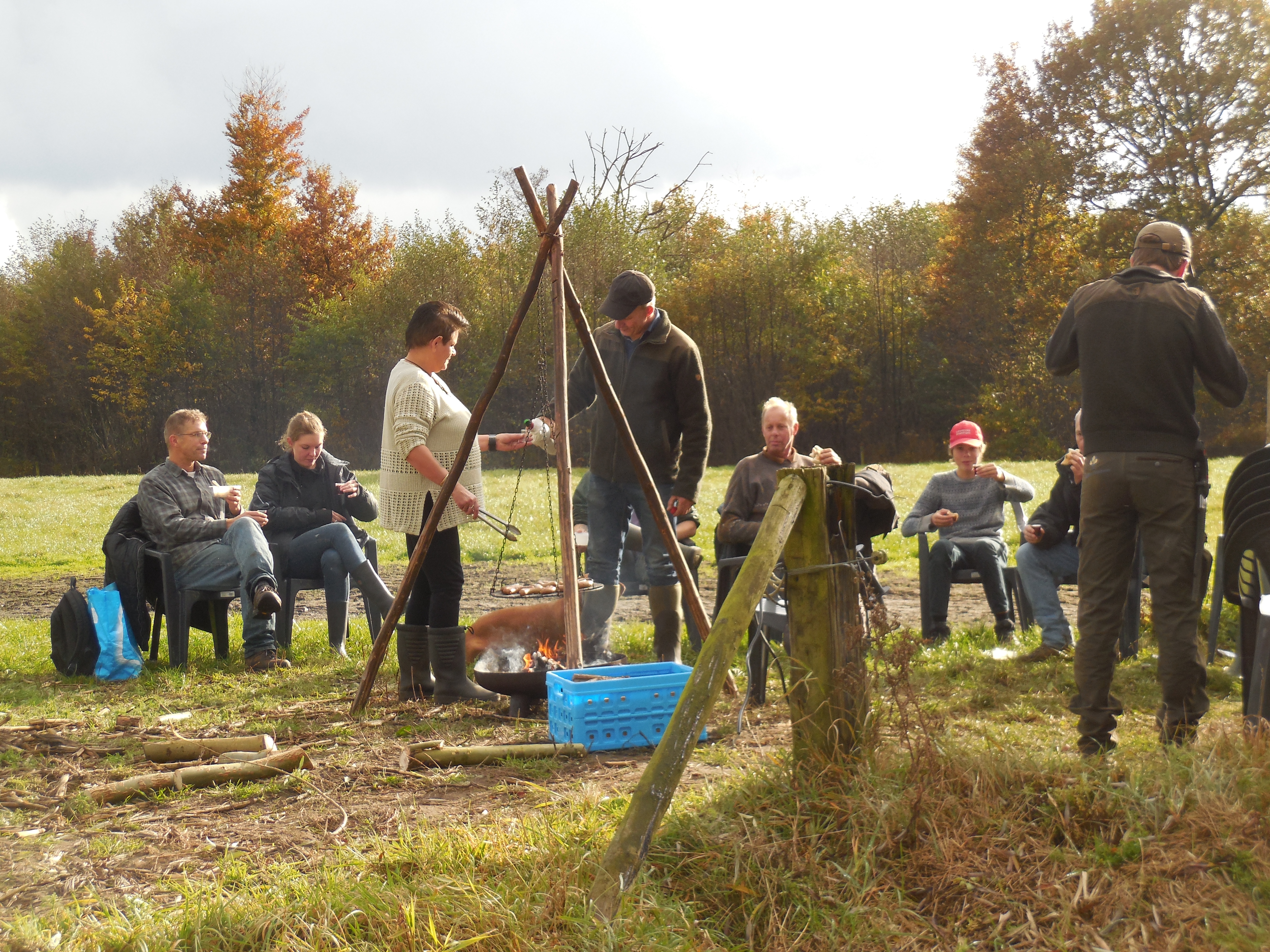 De werkdag werd bezegeld met een welverdiende kop soep en een broodje worst, met z’n allen zittend om het vuur en voor de volwassenen een glaasje bessen, dat traditie bleek te zijn. De gezelligheid, saamhorigheid en de ontspannen en gemoedelijke sfeer hebben er zeker ook aan bijgedragen dat we een heerlijke ochtend hebben gehad. Wat ons betreft gaan we volgend jaar weer.
