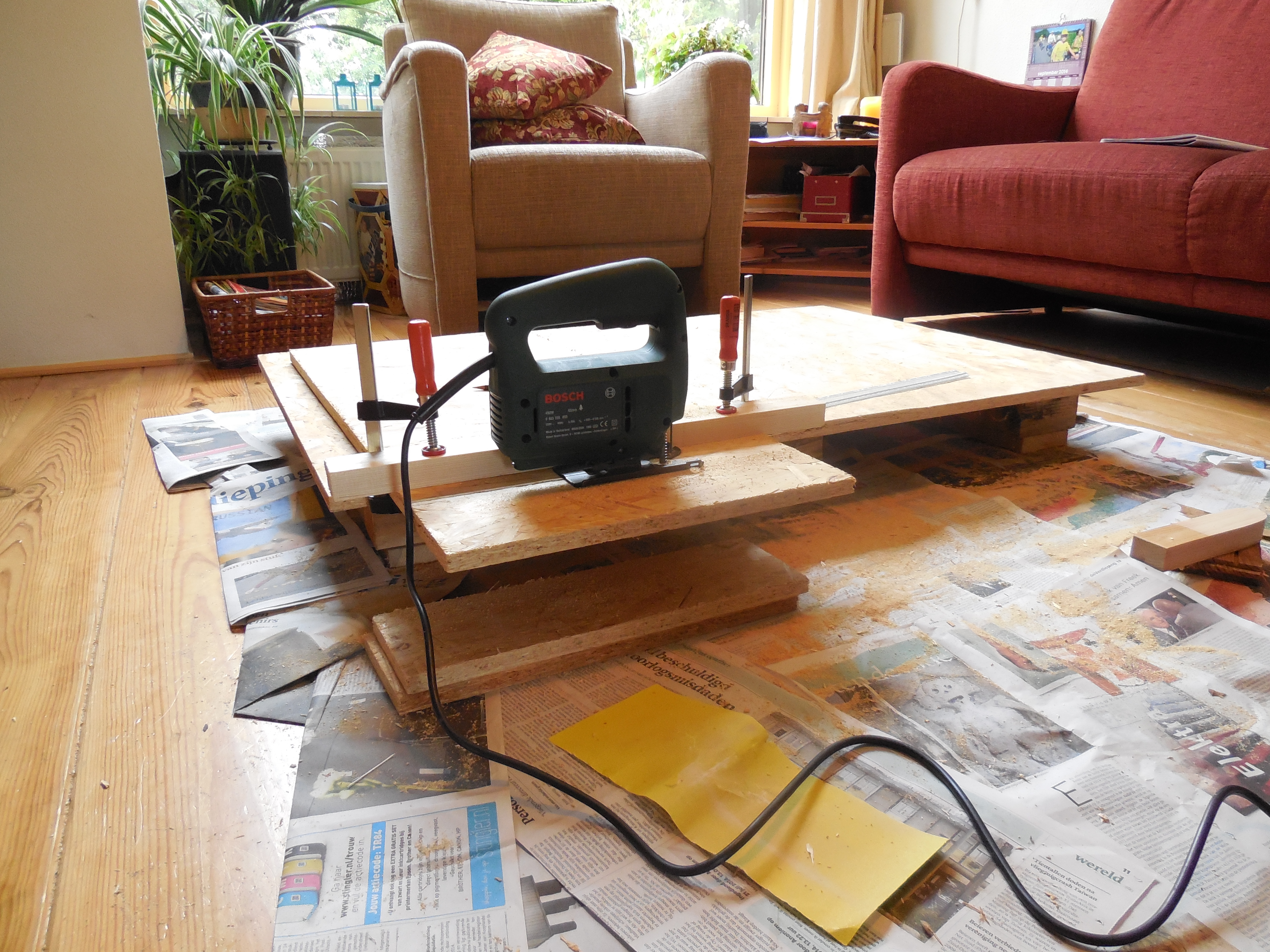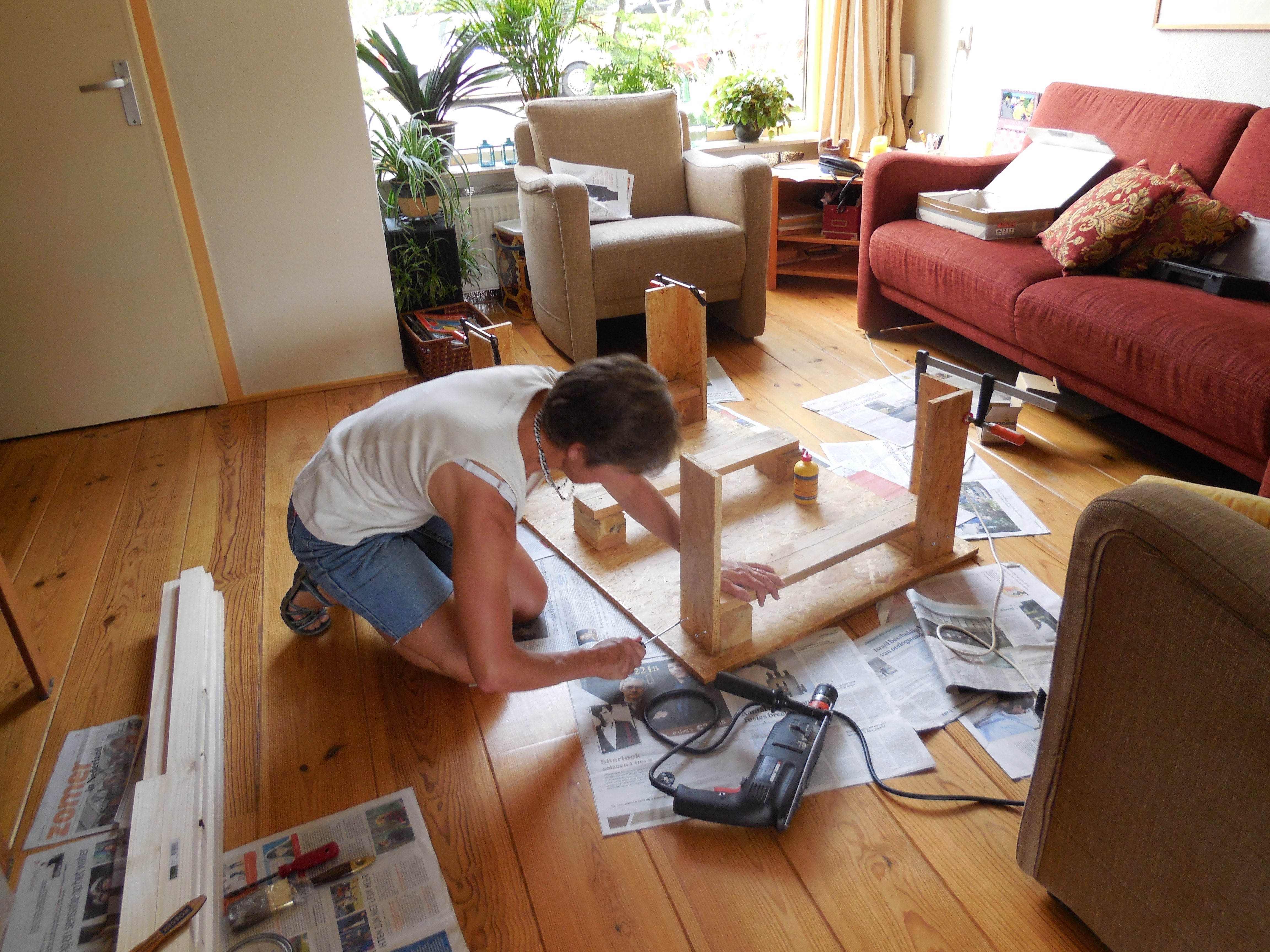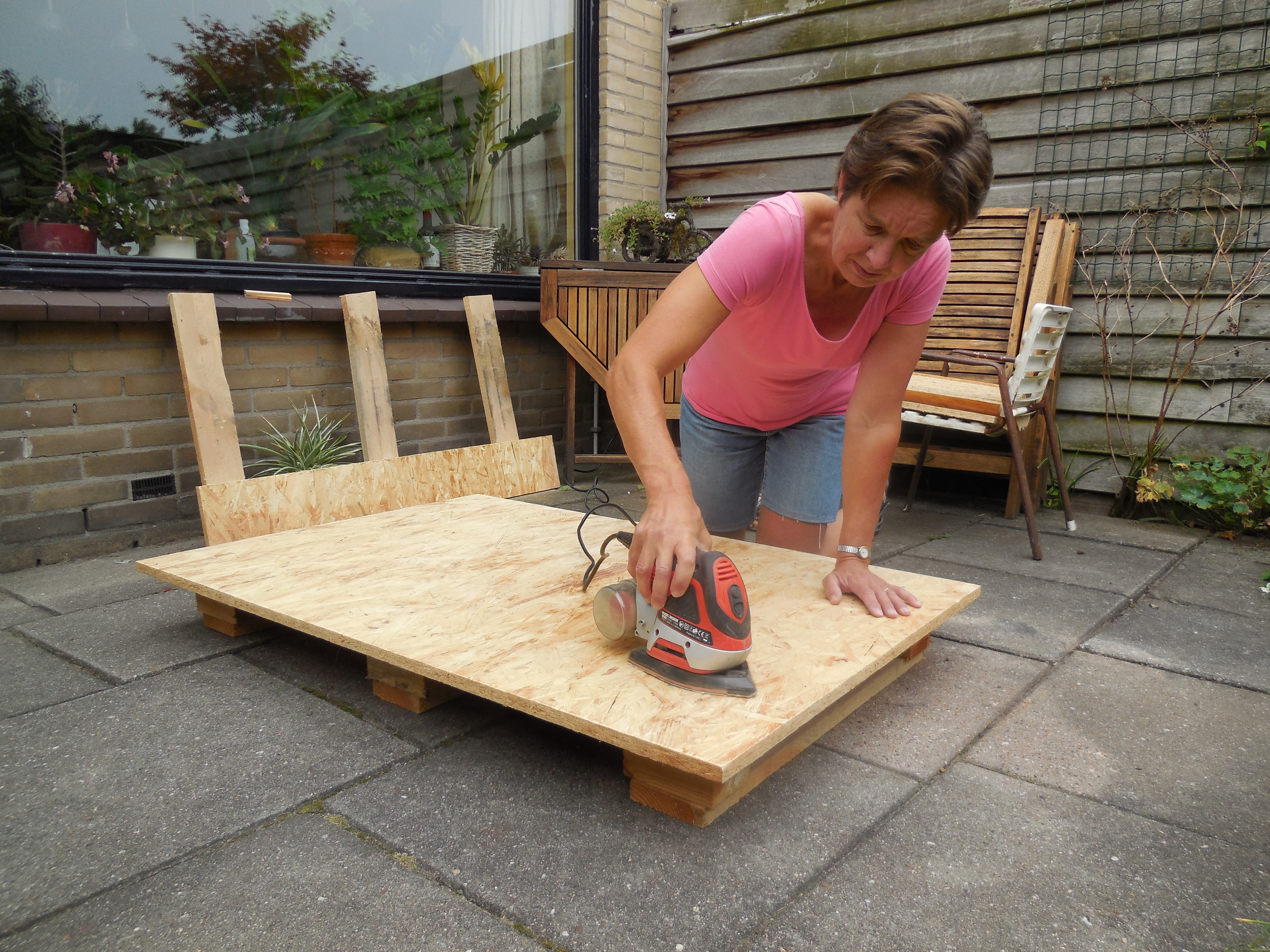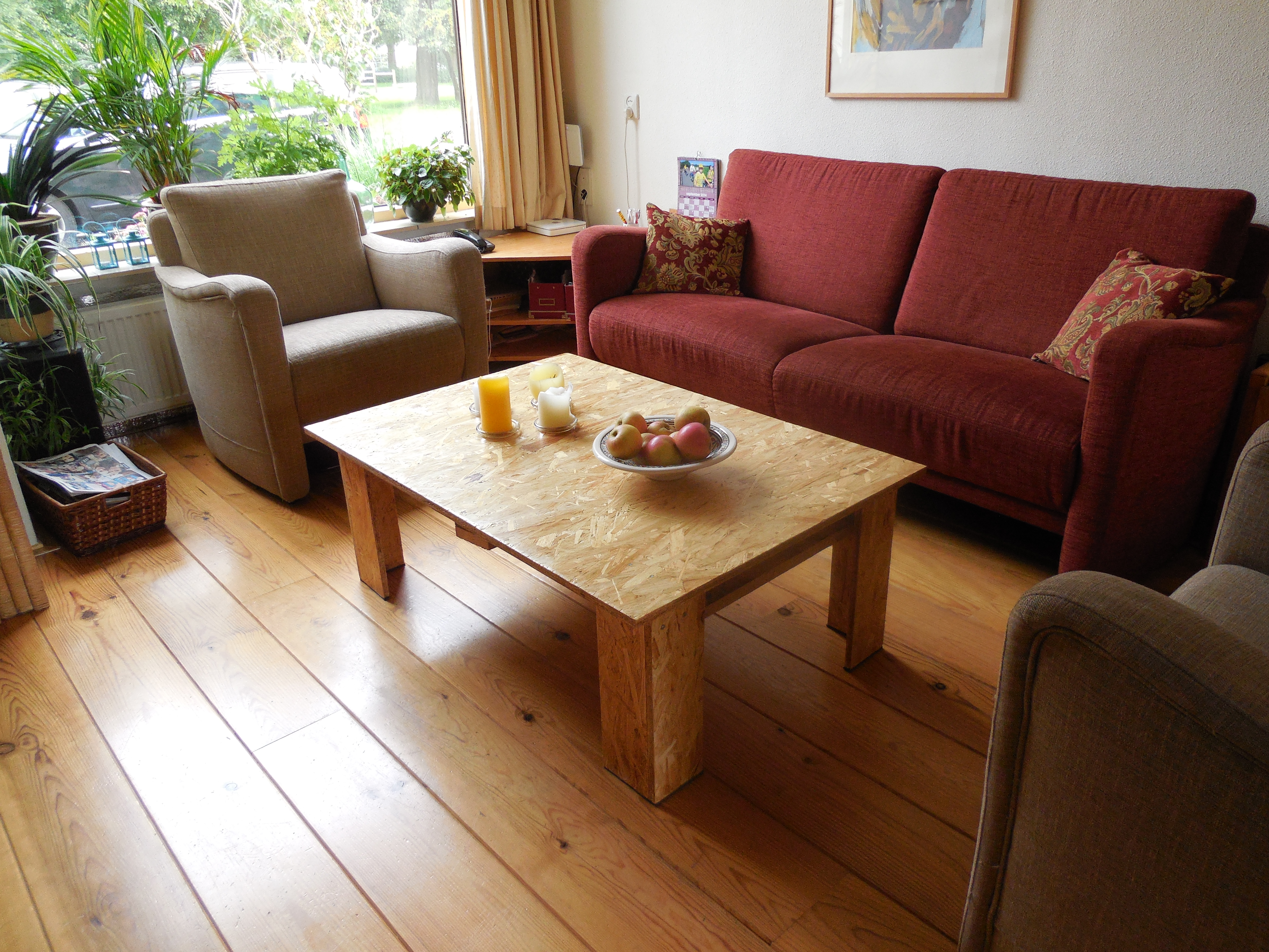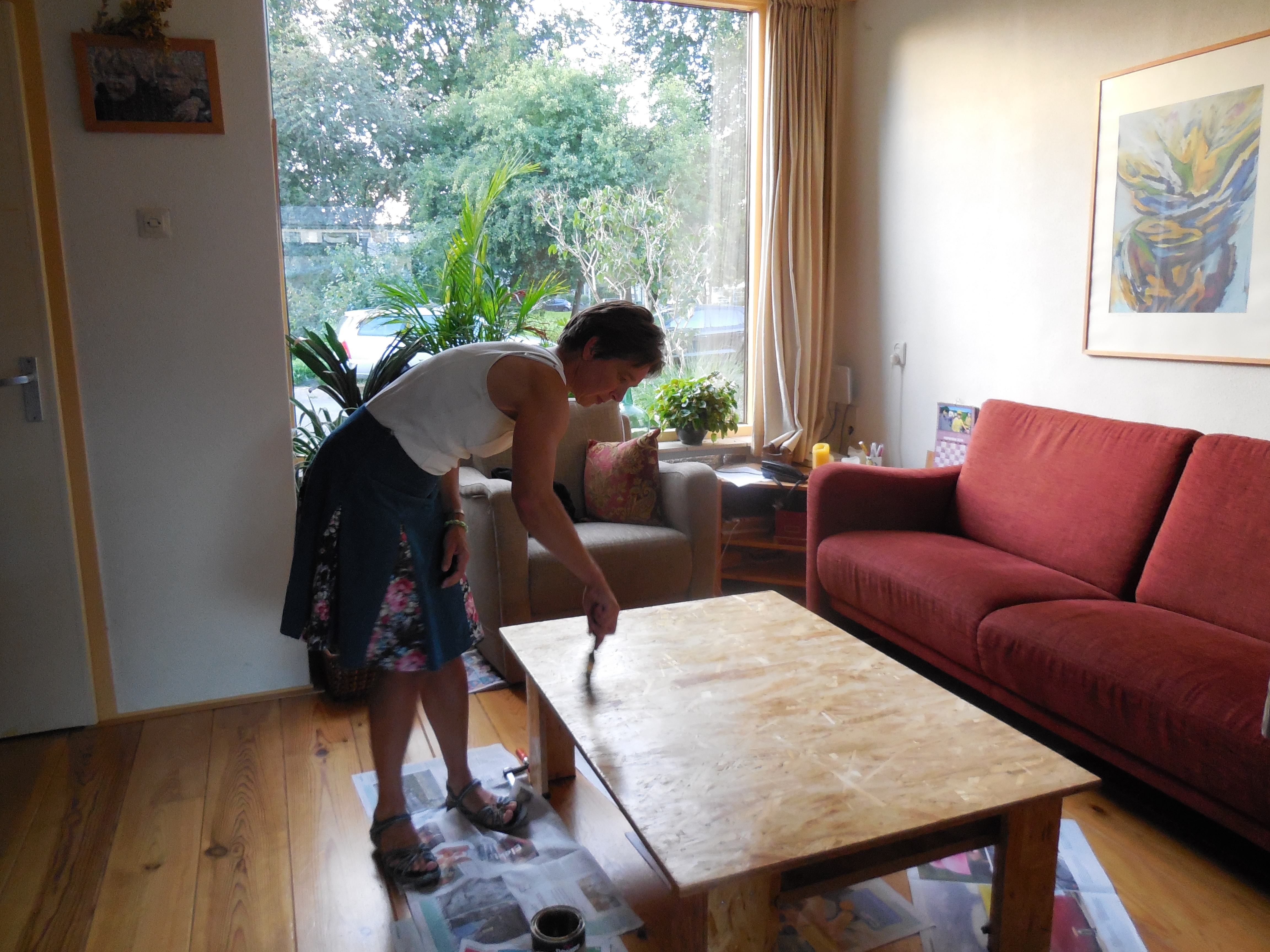 Wij het dak op zolder aan het isoleren. Je wilt niet weten hoeveel ruimte dat isolatiemateriaal inneemt als je nog niet zover bent om het allemaal in één keer ter verwerken. Maar dat terzijde. Dat isolatiemateriaal (uiteraard biologisch verantwoord) werd aangeleverd op een enorm pallet. En wat bleek: het was een weggooipallet, het hoefde niet terug. Het lag bij ons in de woonkamer op de grond, op de plek waar ooit nog wel eens een salontafel zou kunnen staan. Je voelt hem natuurlijk wel aankomen. Het idee werd geboren om van het pallet een tafel te maken. Het was een kwestie van wat zagen, schroeven en lijmen, schuren en lakken. Het zelf iets maken van ‘afvalmateriaal’ geeft veel plezier en een enorme voldoening. En ik zal eerlijk zeggen dat ik trots ben op het resultaat, want de tafel is nog mooi ook.