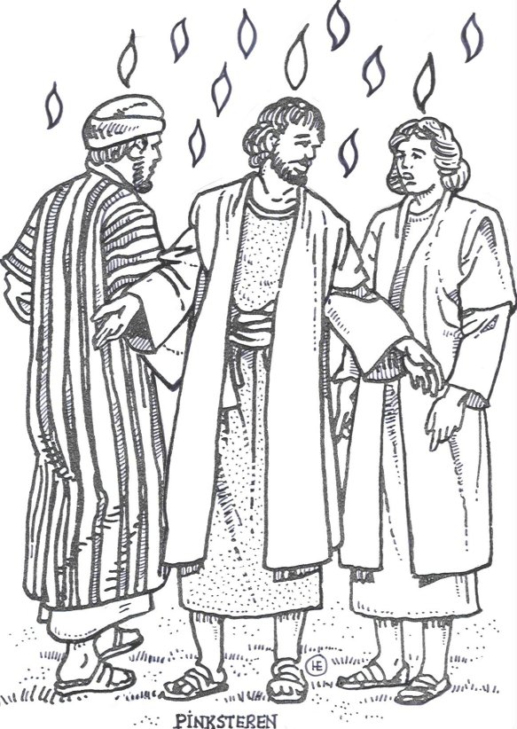 Plotseling hoort iedereen het gebulder van een storm, maar het waait niet. Het lawaai vult de tempel. Op hetzelfde moment zien de bezoekers vuurvlammen, die op Jezus’ volgelingen neerkomen en zich verspreiden, maar zonder dat er iets verschroeit of verbrandt. Vuurtongen zijn het, die de tongen van Jezus’ volgelingen in beweging zetten. Ze gaan praten, vertellen. De omstanders horen hen in allerlei talen praten. Iedereen vertelt enthousiast wat Jezus gedaan heeft, elk in een andere taal.